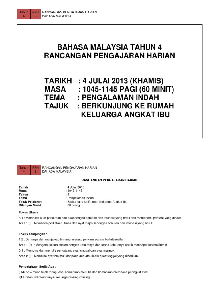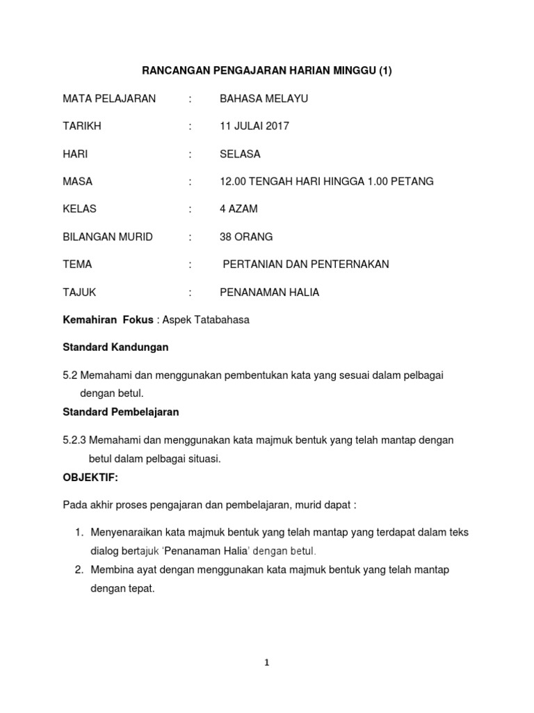 - murid menyebut secara lisan frasa ayat tunggal dan ayat majmuk pada petikan teks Panduan melintas jalan r aya- guru menilai bacaan lisan murid dari segi kelancaran sebutan dan intonasi menggunakan jadual penilaian kemahiran. 10 rows RANCANGAN PENGAJARAN HARIAN Mata pelajaran. 30 orang Mata Pelajaran.